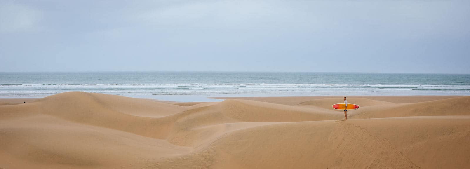 Philipp, selbst ein talentierter Fotograf und Monokel Berlin Stammkunde, hat sich in einer unserer Maßhemden an einem einsamen Strand in Marokko mit einem Vintage Surfboard ablichten lassen.