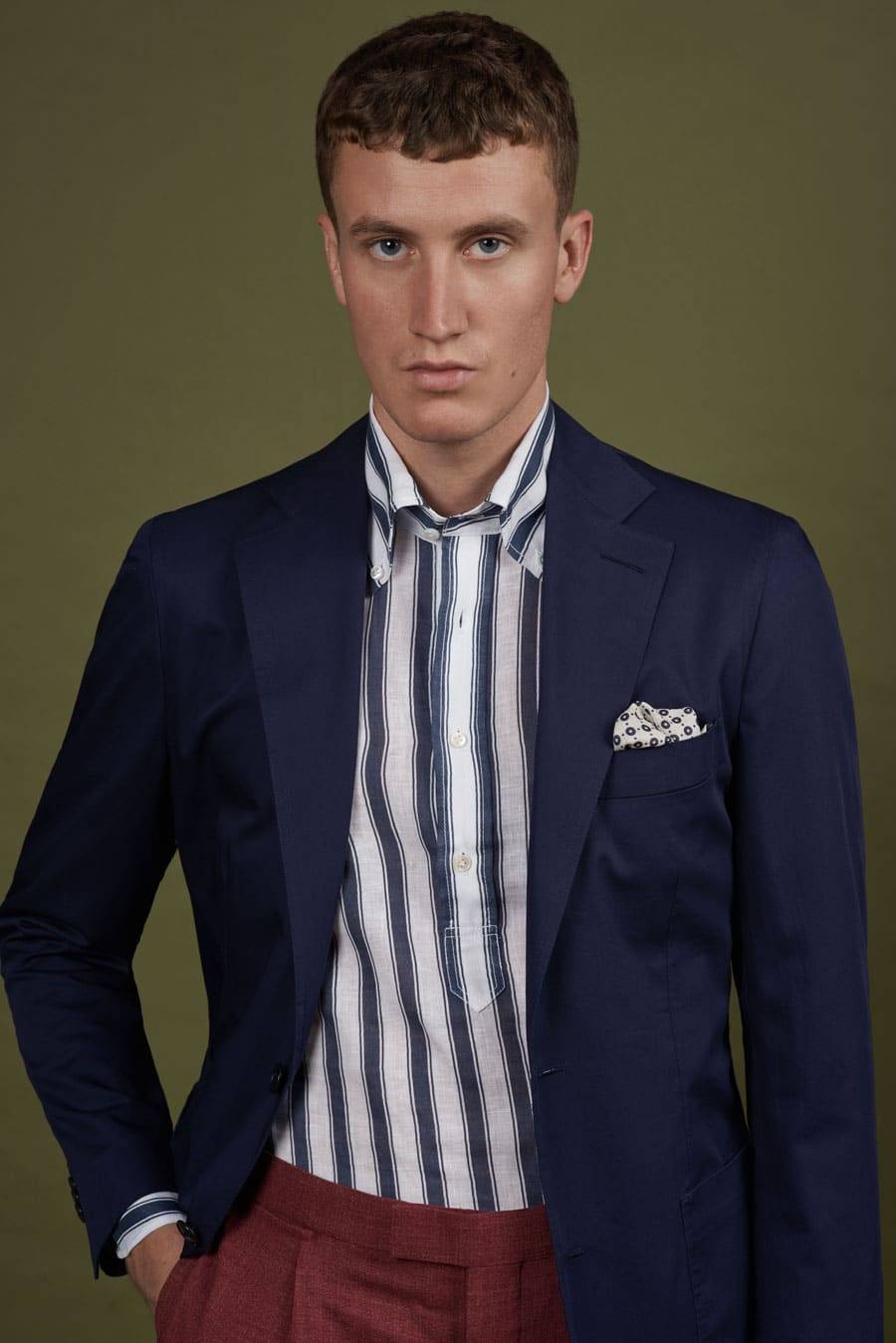 Hier präsentiert als einreihiger Blazer ohne Einlage oder Schulterpolster für ein noch angenehmeres Tragegefühl. Passt perfekt zur blauen Chinohose, Jeans oder als Broken-Suit.