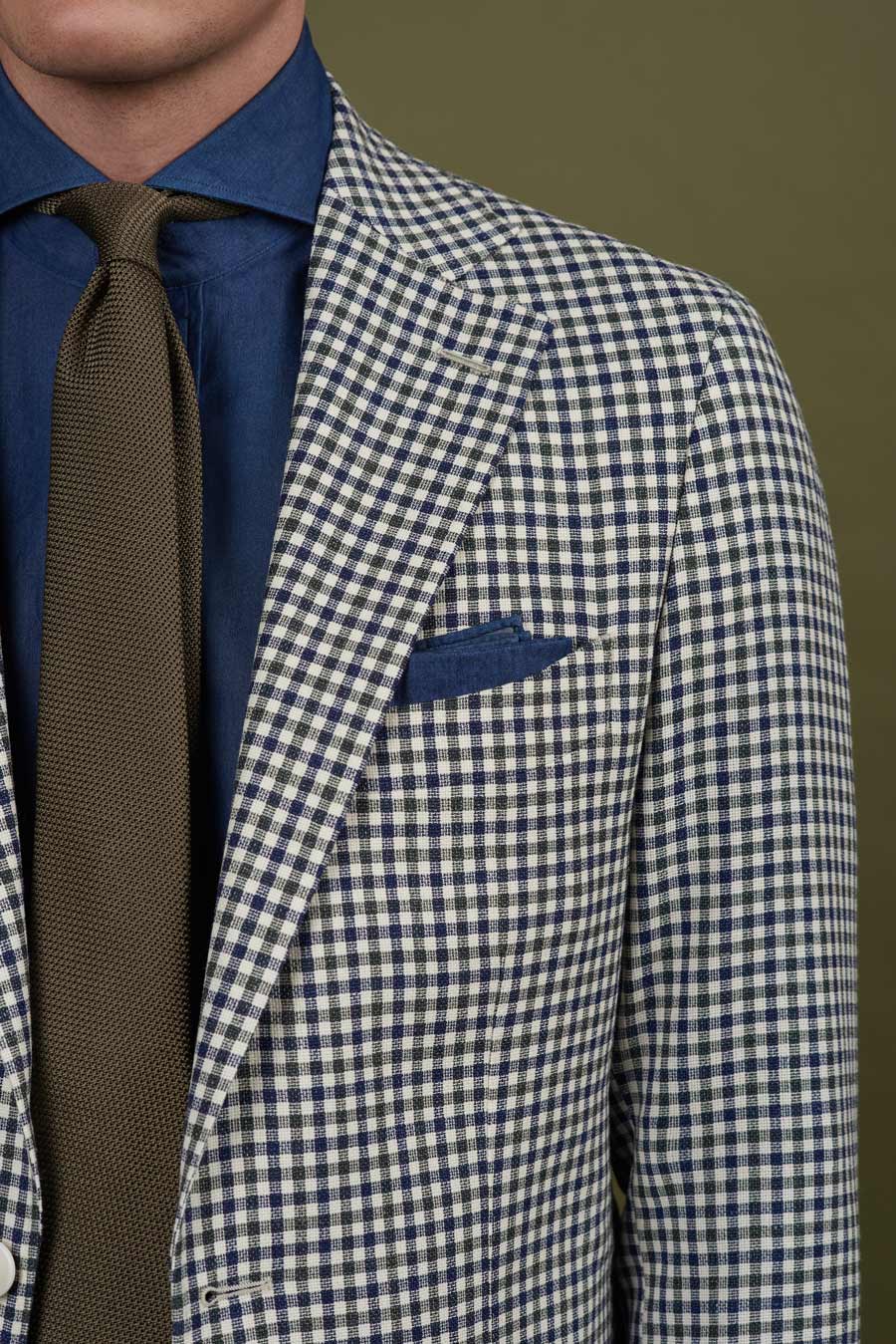 Ein Full-Canvas Maßanzug aus einem Blau/Grün/Creme gecheckten Schurwolle Stoff mit verblüffendem Effekt.