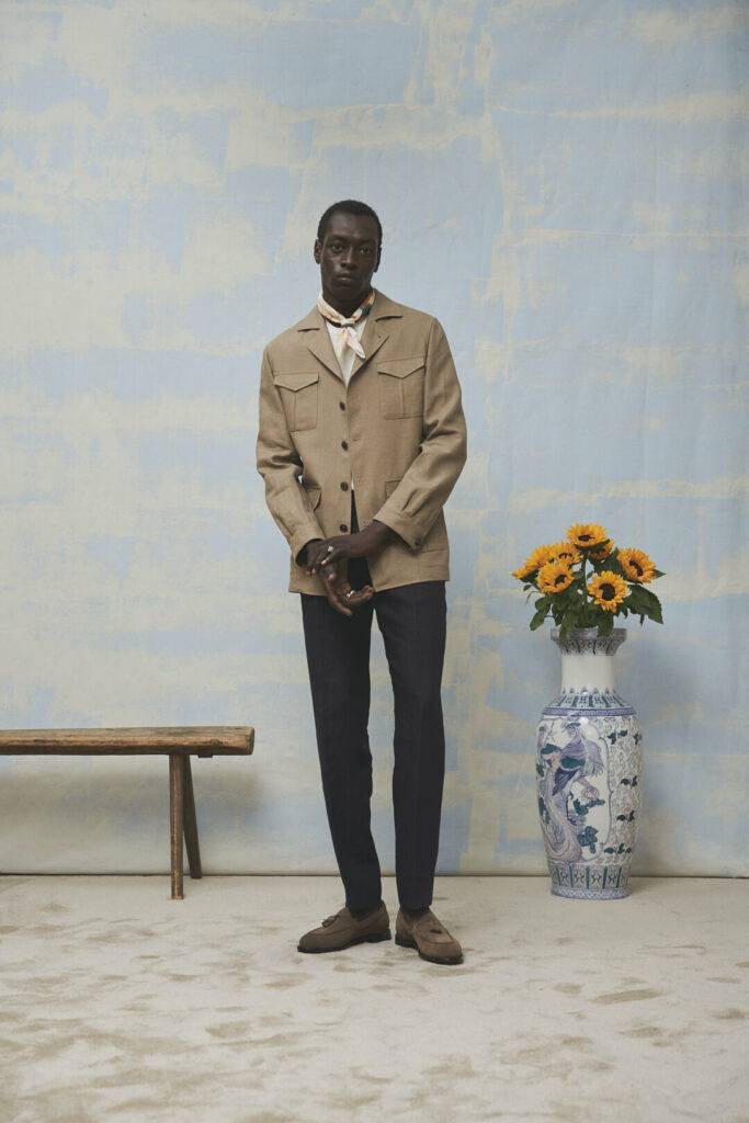 Wer sagt, dass ein Hochzeitsoutfit immer ein Anzug sein muss? Navy Leinenhose, off-white Knit Shirt, taupefarbenes Safari-Jacket – dazu ein Halstuch als Akzent. Casual Chic bedeutet bewusst entspannt, aber nicht beliebig.