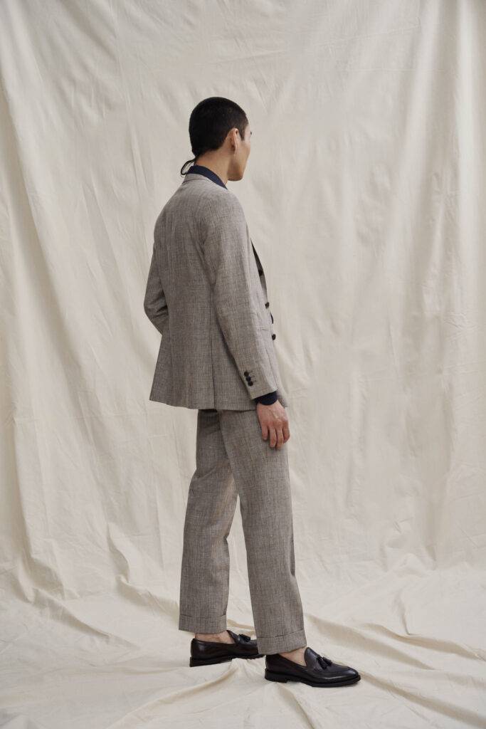 Für Frühlingshochzeiten eignen sich besonders Leinen, High Twisted Wool und Wolle-Leinen-Mischungen. Sie sind atmungsaktiv, temperaturregulierend und behalten ihre Form – auch nach Stunden.