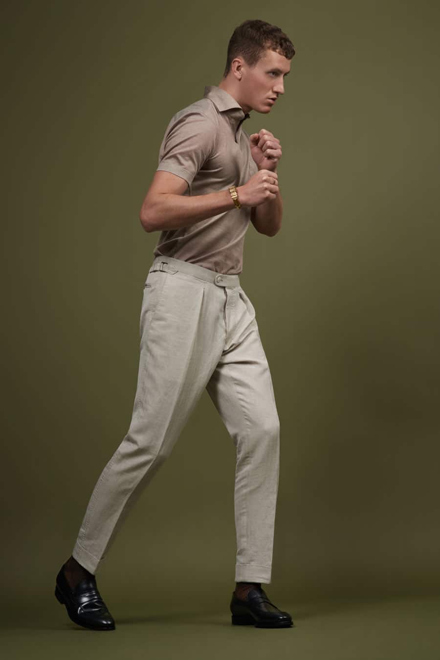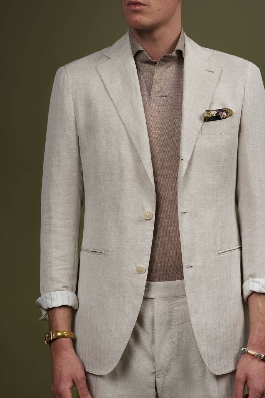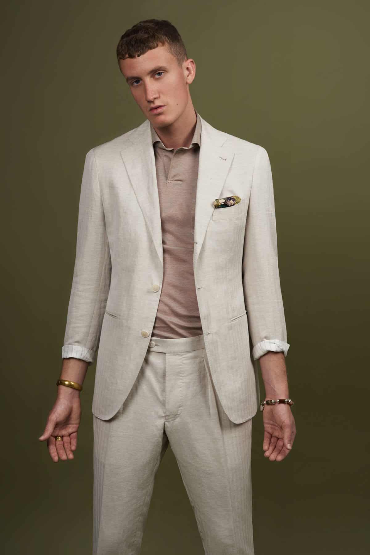 Der perfekte Sommeranzug, cremefarben und aus 100% Leinen mit einem dezenten Herringbone-Muster. Ideal dazu trägst du ein maßgeschneidertes Polohemd wie z.B. dieses hellbraune Knit-Polo mit Haifischkragen und kurzen Ärmeln.