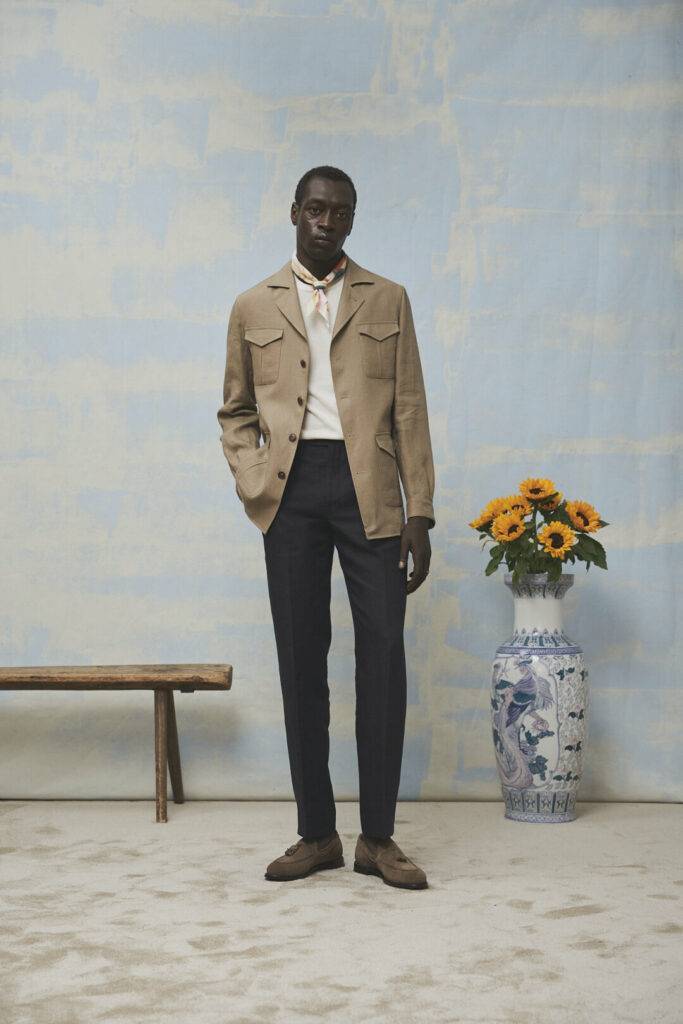 Wer sagt, dass ein Hochzeitsoutfit immer ein Anzug sein muss? Navy Leinenhose, off-white Knit Shirt, taupefarbenes Safari-Jacket – dazu ein Halstuch als Akzent. Casual Chic bedeutet bewusst entspannt, aber nicht beliebig.