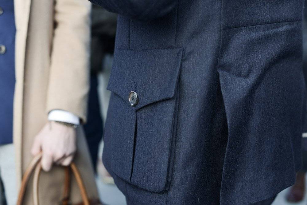 Ein oft gesehenes Element am Anzug/Maßanzug und Mantel waren aufgesetzte Taschen, welche dem Outfit eine mehr lockere Optik geben. Egal ob Rund, mit Patte oder Ziehharmonika, Hauptsache aufgesetzt. Finden wir super!