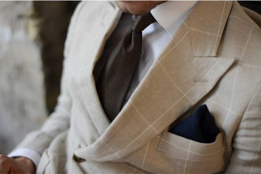 Glatt steht z. B. für Eleganz und Power, aber man kann auch zu glatt daherkommen. Ihr könnt glatte Materialien mit aufgerauten Stoffen kombinieren, um dem entgegen zu wirken. Versucht auch hier eine Balance hinzukriegen. Auch die Textur muss zur Jahreszeit und zu eurem restlichen Outfit passen: Die Leinenhose passt z. B. nicht zur Wollkrawatte.